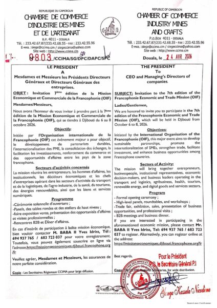 Il est porté à la connaissance de nos ressortissants que la structure dénommée La Lettre Sarl organise un colloque international qui se tiendra le 23 Avril 2026 à l’hôtel Krystal Palace de Douala.